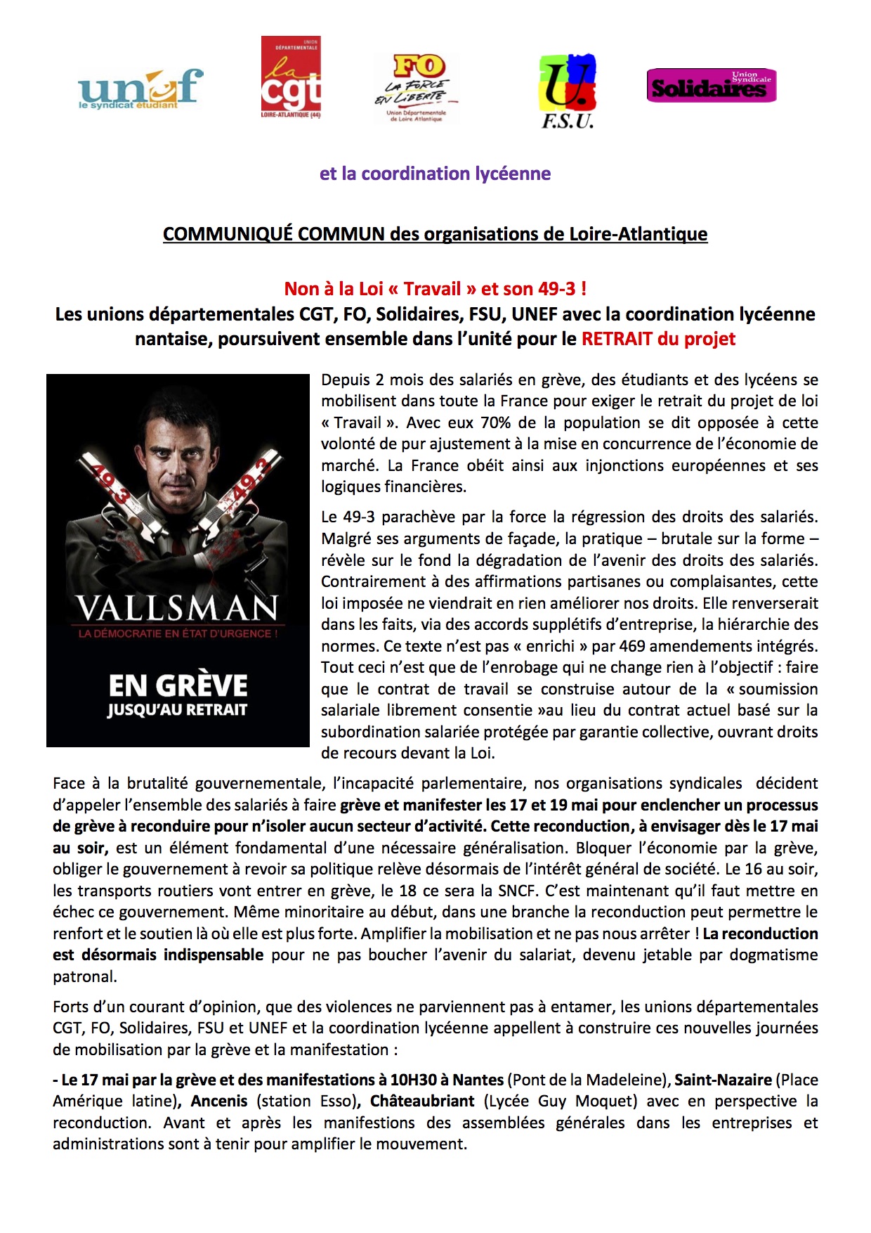 ← Communiqué CGT, FO, FSU, Solidaires, UNEF, UNL, FIDL Projet de Loi travail : amplifier la mobilisation face au déni de démocratie !