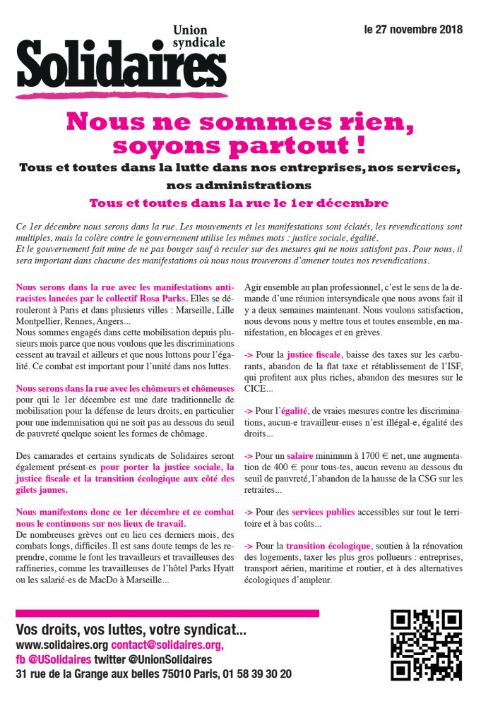 Nous ne sommes rien, soyons partout ! Tous et toutes dans la rue le 1er décembre