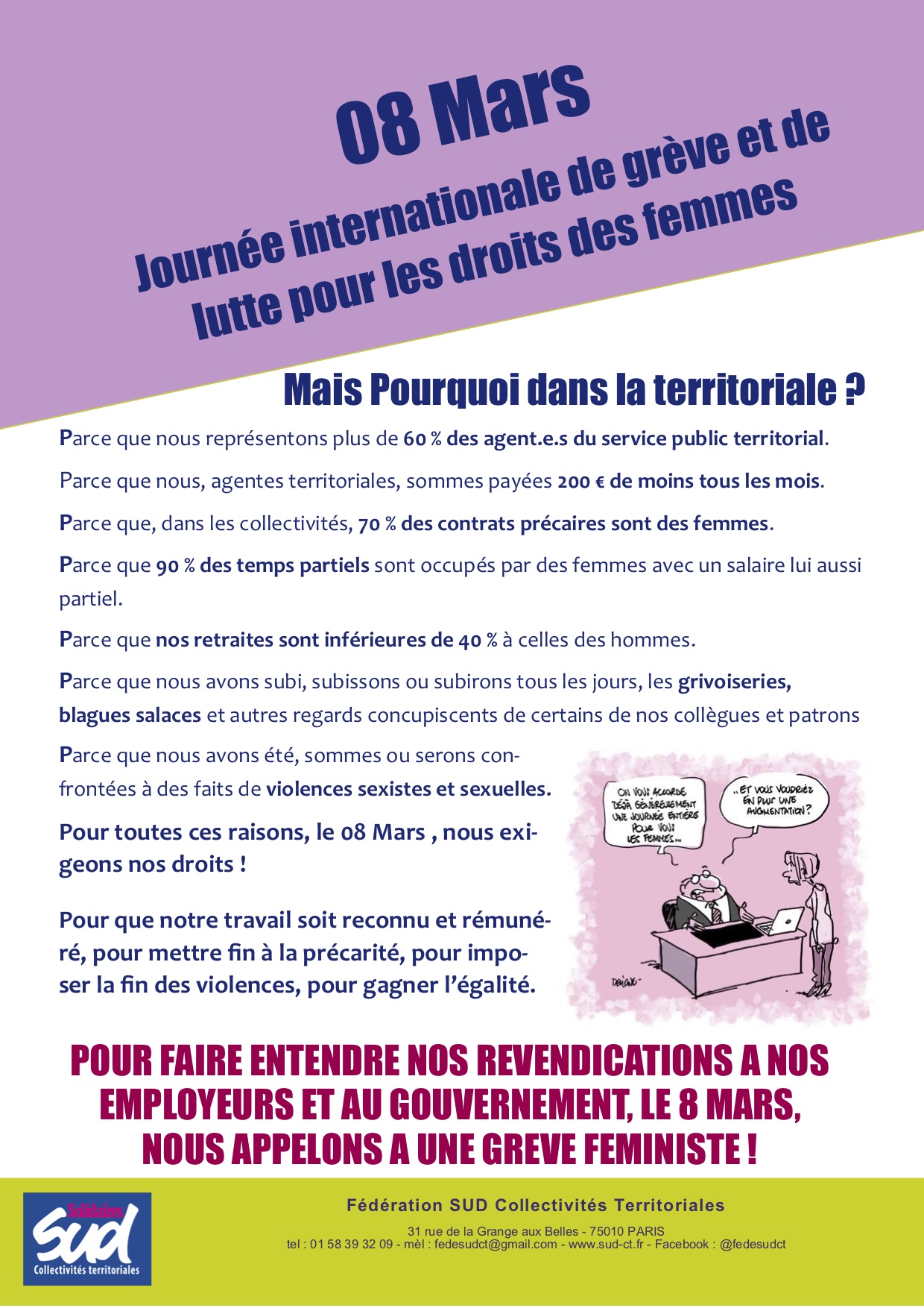 Le vendredi 8 mars 2019, SUD CT 44 se mobilise dans une journée d’action, appelle à faire grève toute la journée ou à débrayer (en grève) et à s’inscrire dans toutes les initiatives unitaires locales.
