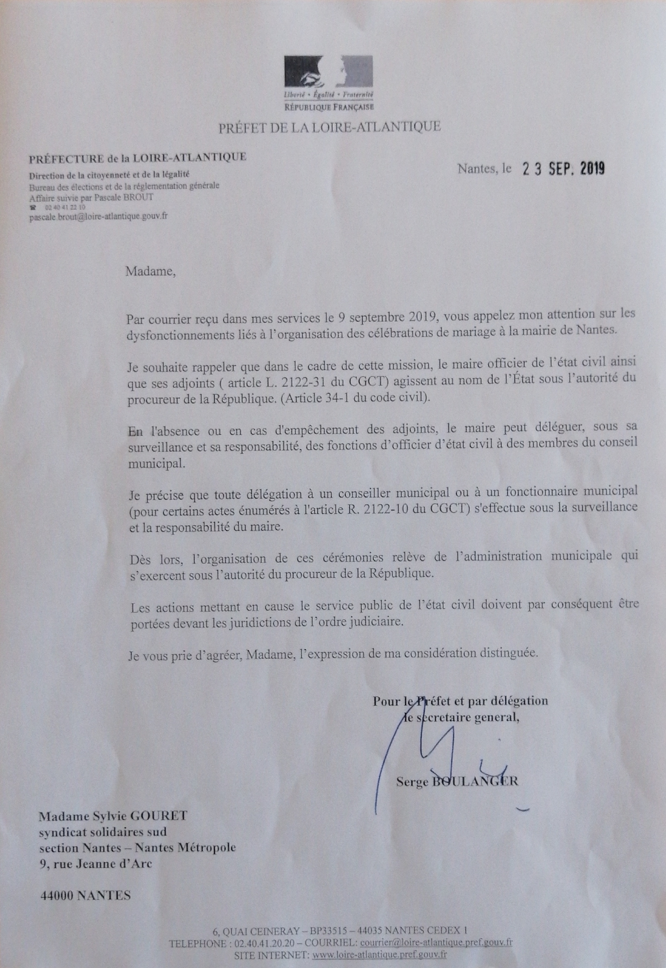 A ce jour l’Etat a répondu pour le procureur et la préfecture par la voix du Préfet aux questions du syndicat SUD sur les conditions d’organisation et de célébration des mariages à la ville de Nantes.