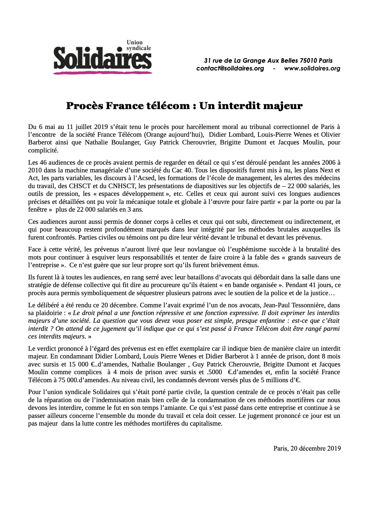 Communiqué de Solidaires suite au verdict du procès Lombard France Telecom →