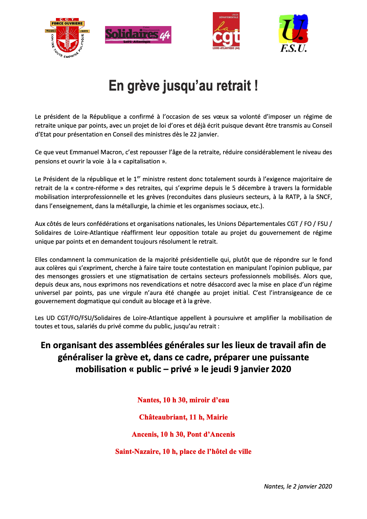 Jeudi 9 janvier 2020, en grève jusqu’au retrait !