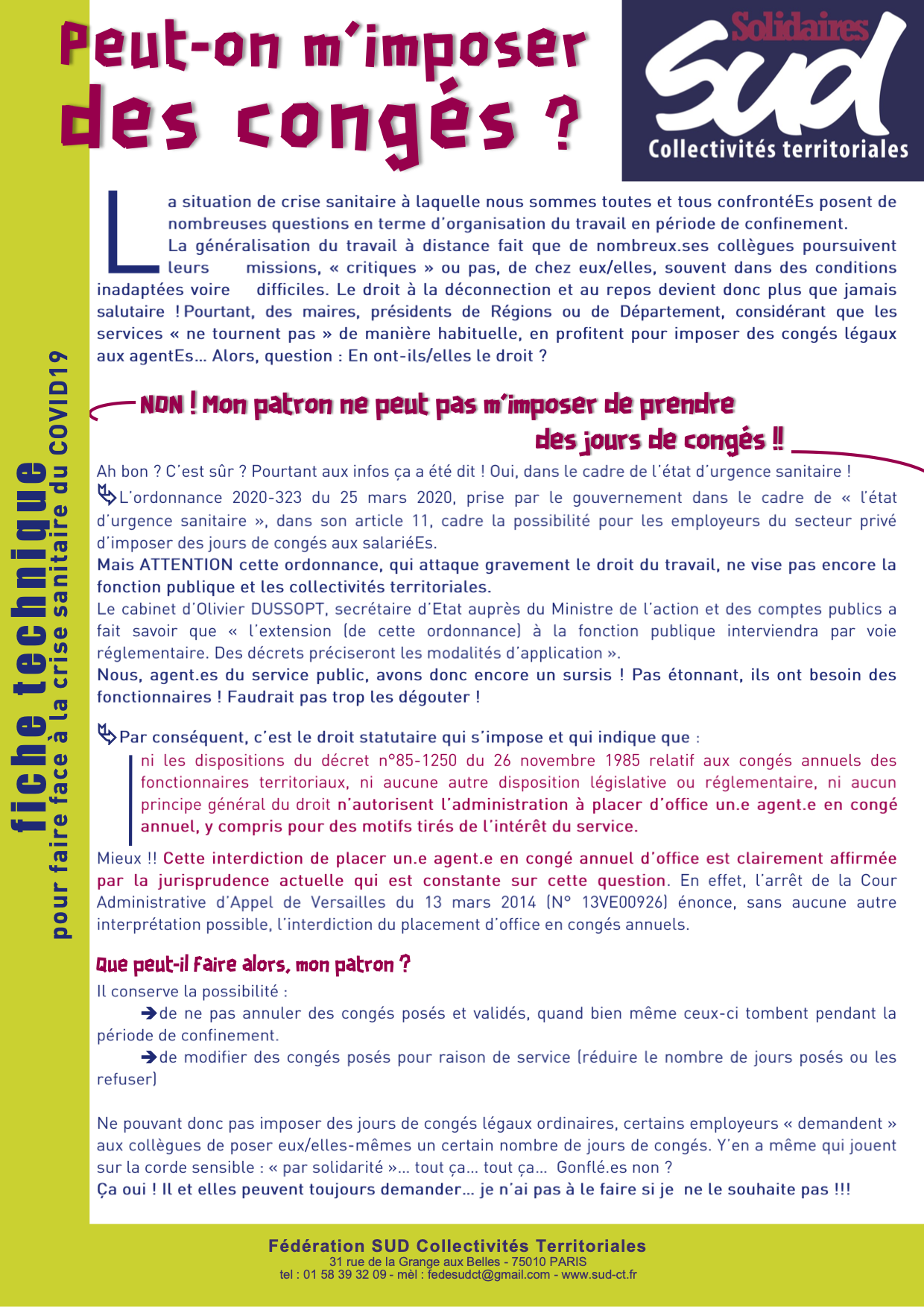 Nous, agent.es du service public, avons donc encore un sursis ! Pas étonnant, ils ont besoin des fonctionnaires ! Faudrait pas trop les dégouter !Par conséquent, c’est le droit statutaire qui s’impose et qui indique que : ni les dispositions du décret n°85-1250 du 26 novembre 1985 relatif aux congés annuels des fonctionnaires territoriaux, ni aucune autre disposition législative ou réglementaire, ni aucun principe général du droit n’autorisent l’administration à placer d’office un.e agent.e en congé annuel, y compris pour des motifs tirés de l’intérêt du service.