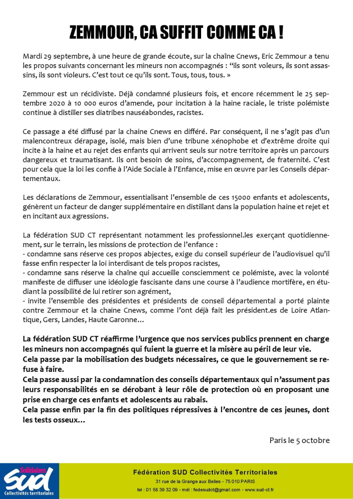 Communiqué Fédération SUD CT ZEMMOUR, CA SUFFIT COMME CA !
