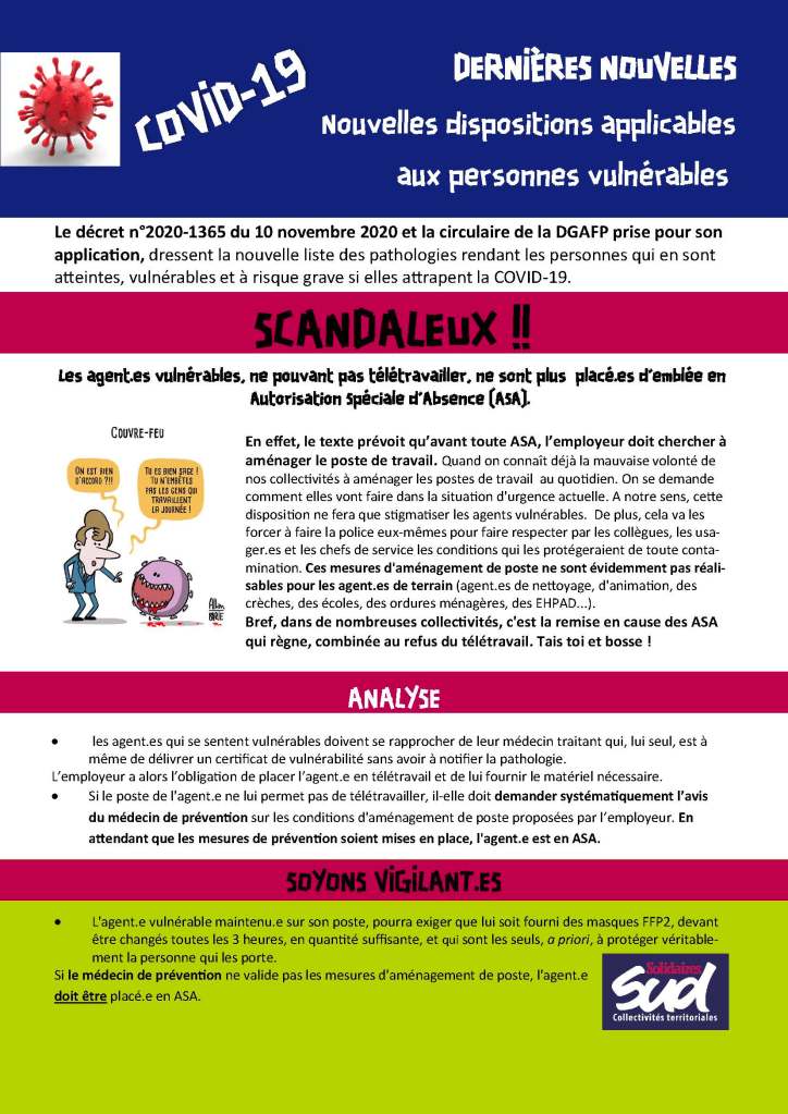 Le décret n°2020-1365 du 10 novembre 2020 et la circulaire de la DGAFP prise pour son application, dressent la nouvelle liste des pathologies rendant les personnes qui en sont atteintes, vulnérables et à risque grave si elles attrapent la COVID-19.