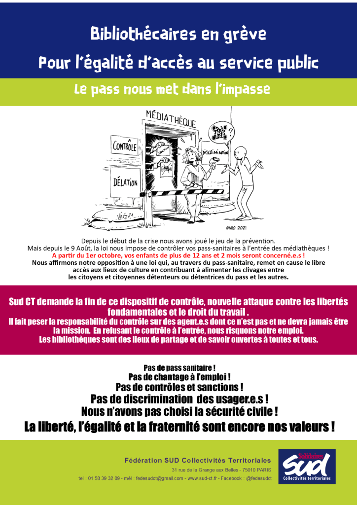 Les bibliothèques et plus généralement les services publics culturels et de loisirs sont obligés depuis juillet 2021 de contrôler l’accès des publics à leur établissements.ce contrôle est majoritairement effectué par les agent.e.s même, ce qui va à l’encontre des missions et de l’accès inconditionnel qui est le cœur de notre ADN. Après la formidable mobilisation du 1er octobre, la lutte peut et doit continuer !