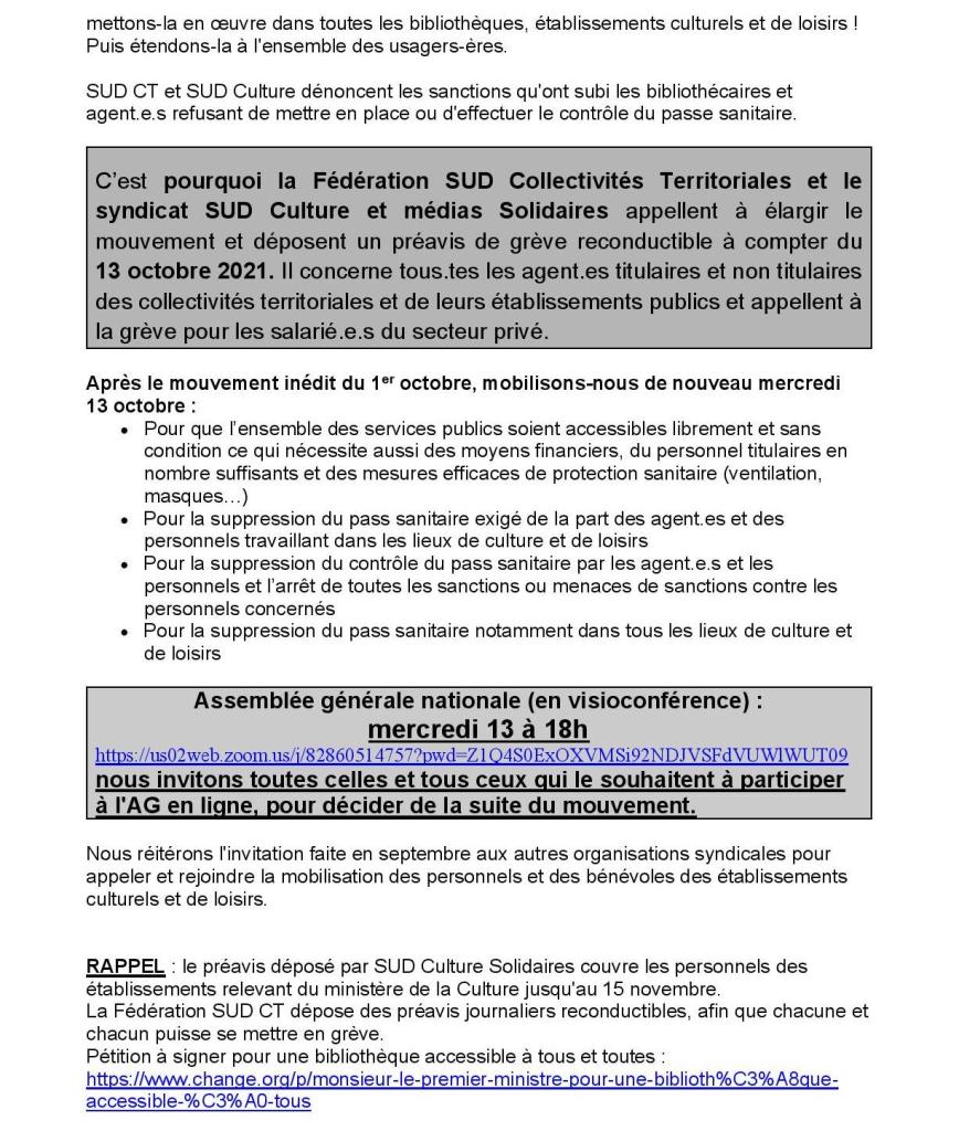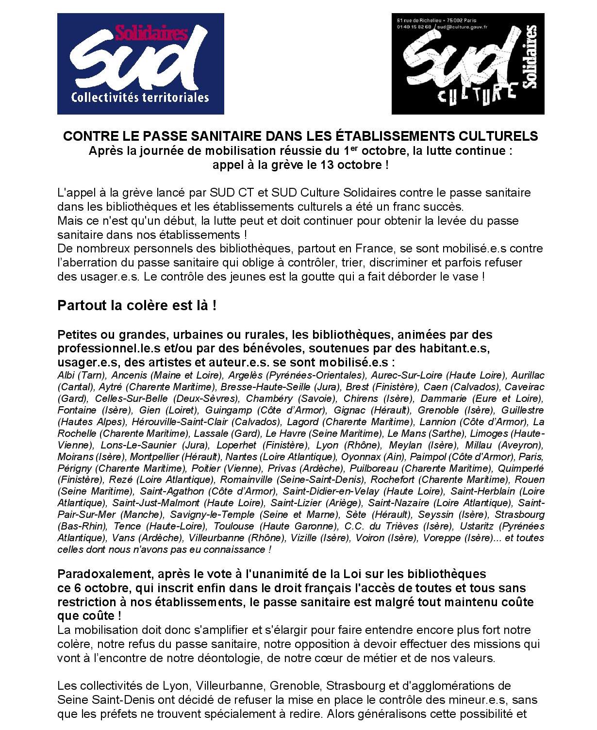 C’est pourquoi, la fédération SUD CT et le syndicat SUD Culture et Médias Solidaires, appellent à une nouvelle journée de mobilisation nationale mercredi 13 octobre. Pour cela, nous déposons des préavis de grève reconductibles..