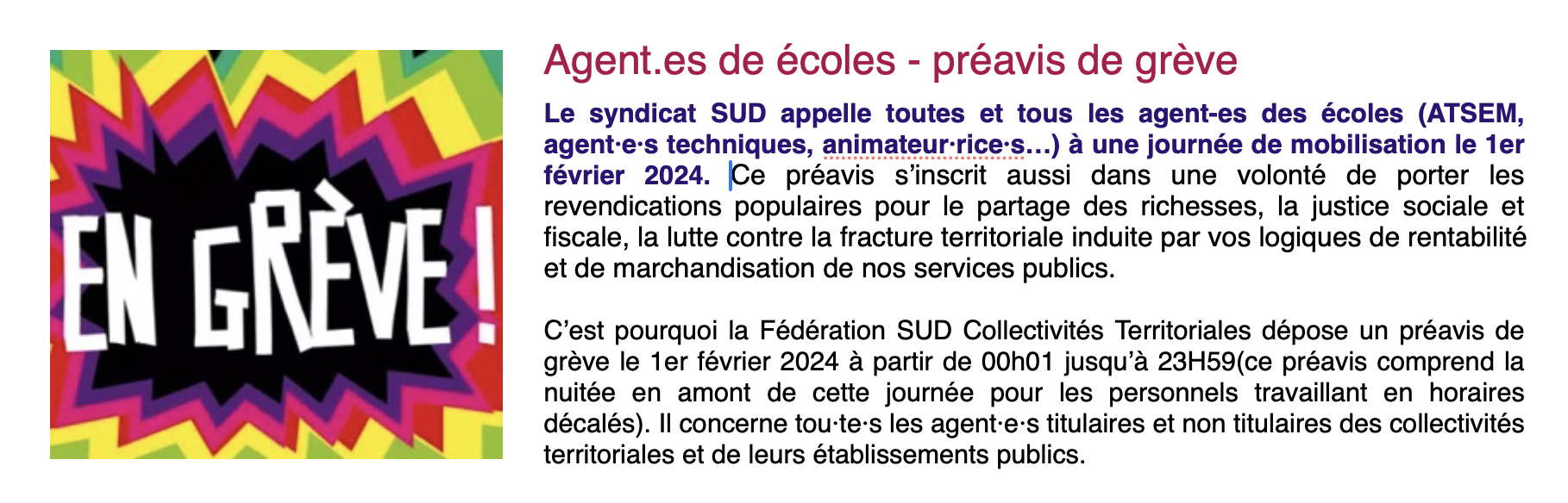 Parce que la Fonction publique est garante de l’intérêt général au service de la cohésion sociale, parce que les moyens existent pour mettre en œuvre des orientations de progrès social pour toutes et tous, le syndicat SUD Collectivités Territoriales, constatant que nos positions ne sont pas entendues et que nos propositions ne sont pas prises en compte, appelle toutes et tous les agent-es des écoles de la Fonction Publique Territoriale (ATSEM, agent·e·s techniques, animateur·rice·s…) à une journée de mobilisation le 1er février 2024.